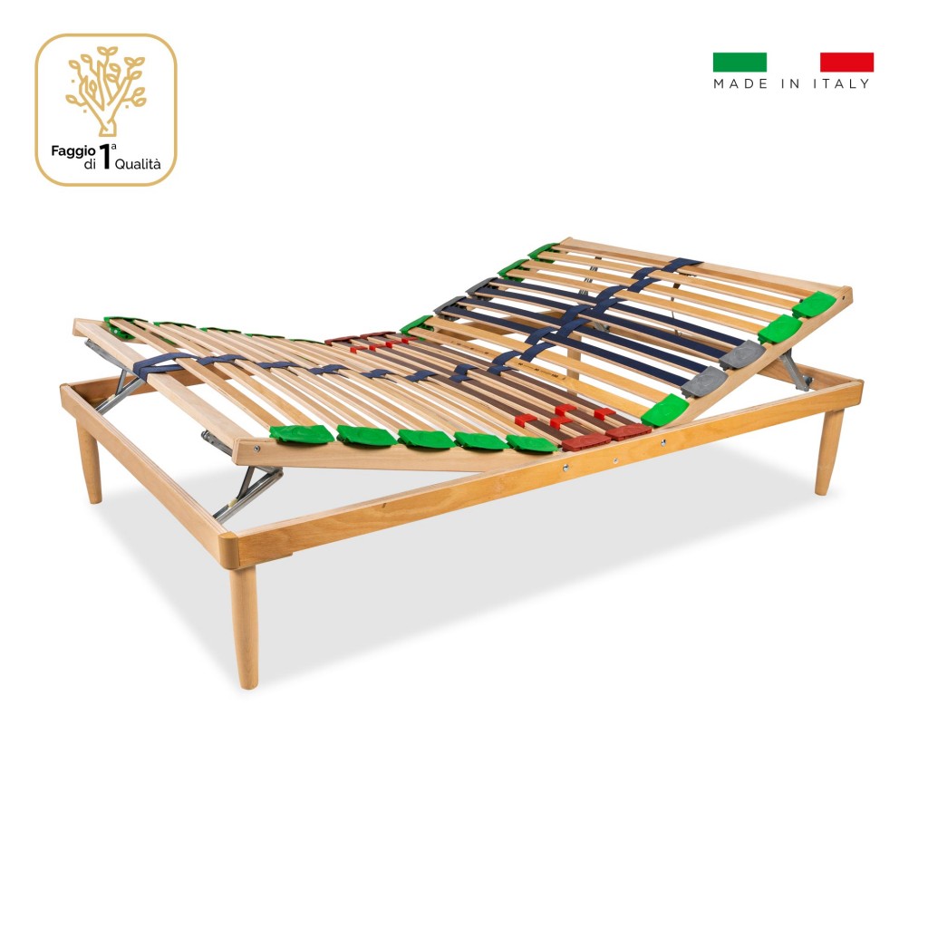 La Rete Best Plus Alzata testa/piedi Manuale è l'ultimo modello di rete, estremamente solida e robusta, ma allo stesso tempo confortevole, offre tutte le garanzie del Made in Italy. Per questa rete manuale abbiamo abbinato una modalità alzata testa-piedi per chi desidera il top nell’ambito del riposo. Dotata di un comfort elevatissimo, avendo la possibilità di inclinare in 7 posizioni differenti la struttura, senza alcuno sforzo. La rete è a doghe in legno di faggio con struttura in multi-strato resinato, con uno innovativo supporto in SBS (ammortizzatori per doghe) color Rosso. Sono presenti 26 doghe (nella misura 160x190) in legno, solide e robuste. Queste ti offrono il massimo della stabilità e accompagnano il tuo riposo permettendoti di dormire meglio. Anche le doghe, grazie al sistema di regolazione del peso e alla profilatura nella parte della zona spalle, contribuiscono ad aumentare il comfort e l’elasticità dell’intera struttura. Per rendere la struttura ancora più confortevole ed ergonomica, sono state inserite delle speciali scanalature GRIGIE nella zona spalle. Queste assorbono meglio il carico del corpo, per un comfort migliorato rispetto ai modelli tradizionali che trovi in commercio.